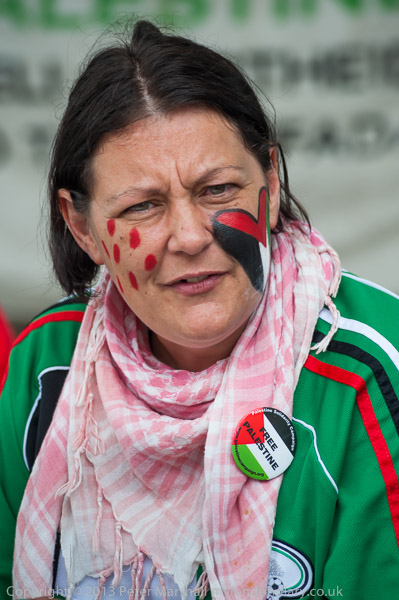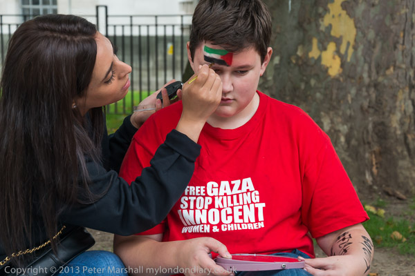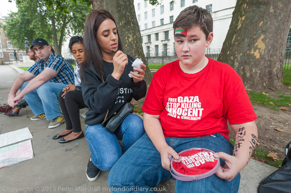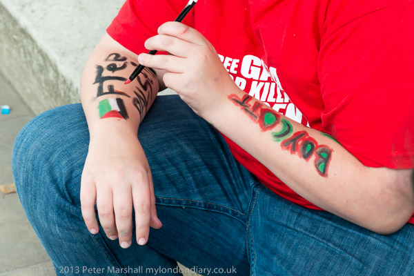 ![]() Painting a Palestinian flag on a protester's face ![]() ![]() They call for a boycott of companies whose profits support Israeli attacks on Palestinians ![]() ![]() People discuss how they are going to protest ![]() ![]() ![]() And line up for photographs beforethey start, holding posters in support of Palestine ![]() |