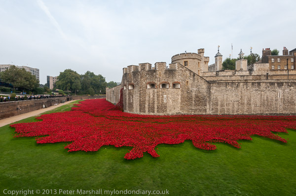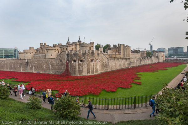 The poppies continue around a third side of the moat around the corner at the far left