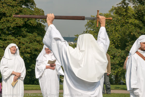 At the top, druids stand to form a gate thorugh which the others pass to form a circle
