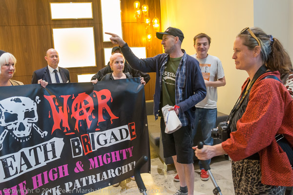 Jane Nicholl enters with the Class War Women's Death Brigade Banner rolled up