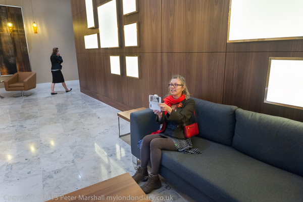Marina Pepper posing in the revolving door entrance alongside the normal 'rich door'