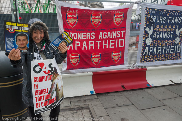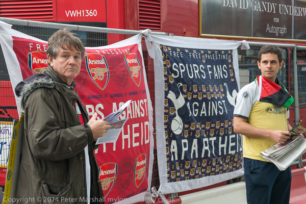 Gooners Against Apartheid and Spurs Fans Against Apartheid banners on the Crossrail fence