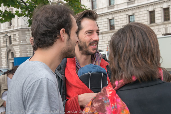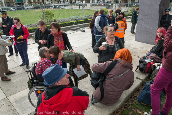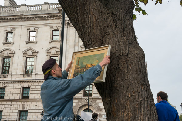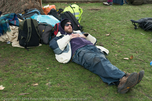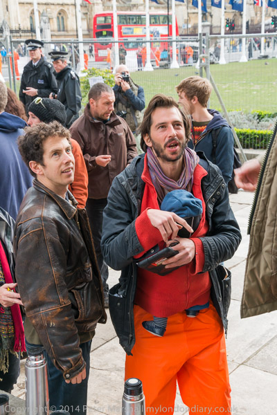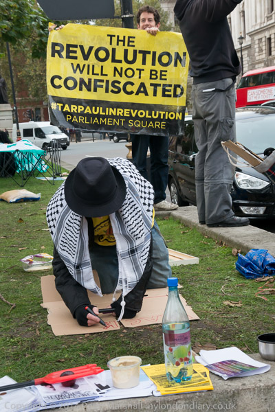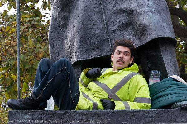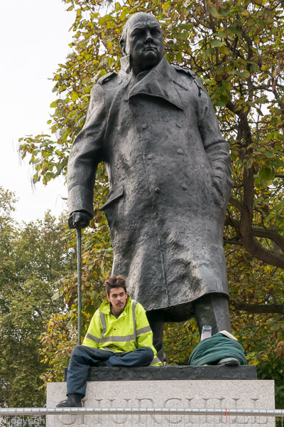 A protester sits on the plinth of Churchill's statue. He had been there around 23 hours when I took this picture