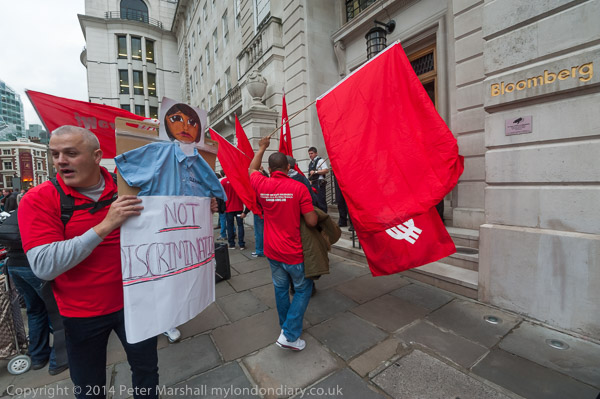 The protesters continue to walk in a circle on the pavement in front of the Bloomberg offices