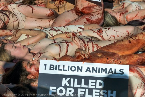 A World Vegan Day protest by PETA dramatised the 255 animals killed for food in the UK every second by a similar number of people lying near naked or nearly naked and smeared with fake blood on a tarpaulin.