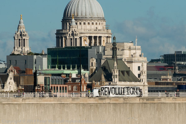 Protesters hold the 'Revolution' banner on Waterloo Bridge - later they took it to Trafalgar Square