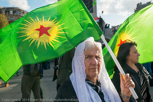 Thousands came to a Trafalgar Square rally for the defenders of Kobane against ISIS and for the remarkable democratic revolution of Rojava, calling for aid for the Kurdish fighters and refugees, legitimisation of the PKK and the release of Ocalan. The protest was part of a Global day of solidarity with the YPG (People's Defense Units) and the women of the YPJ fighting against ISIS at Kobane.