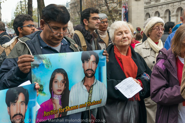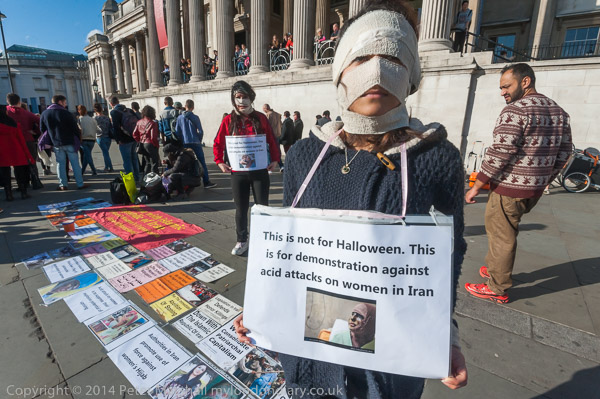 The 8th March Women's Organisation (Iran - Afghanistan) protested in Trafalgar Square against acid attacks on women who do not wear a veil in Iran. Attacks by gangs encouraged by the regime to enforce strict Islamic rules have left many women scarred and blinded.