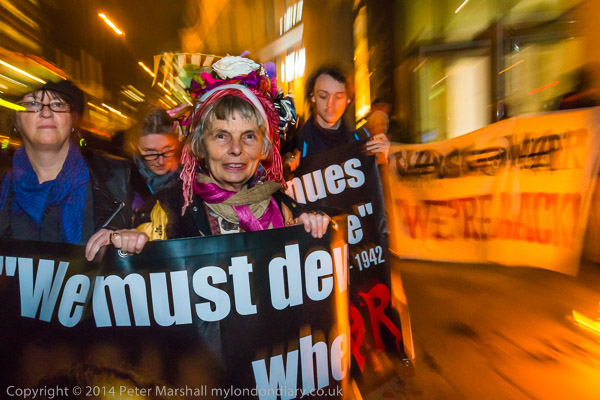 Pensioners and their supporters met outside Charing Cross Station, where one campaigner, Obi (Lorenzo Abadinas) from Occupy who was live-streaming the event stripped to the waist for the protest which certainly made me feel cold, and though there was a weak winter sun, there was also a quite biting wind, and the rest of us were glad to be well wrapped up. He handed London Green MEP Jean Lambert of large felt pen for her to write a message across his chest with the Twitter address for the event, @fuelpovaction.