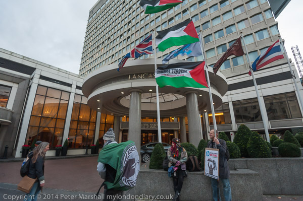 Campaigners with Palestinian flags outside the Lancaster London Hotel at Lancaster Gate