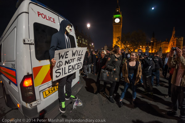 The march of hundreds of people were met by a mass of barriers around the square with large groups of riot police threatening them. The marchers called on the massed riot police to put their batons away and join their Guy Fawkes party without success. They marched around the square and then left in several directions, some heading for Buckingham Palace. I decided I'd had enough of taking pictures in the dark and went home.