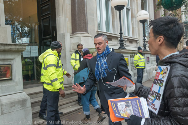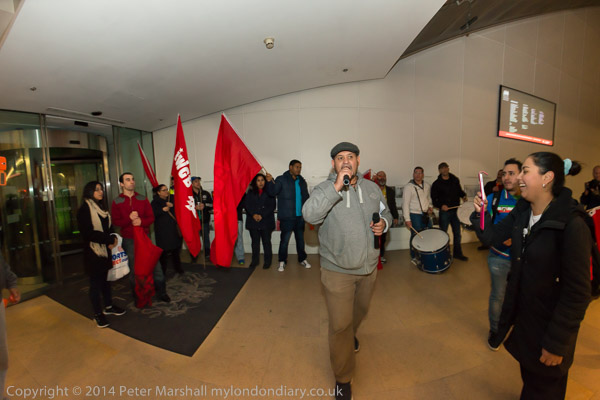 The cleaners walked down Fleet St and across Aldwych, regrouping a short distance from the Royal Opera House for a short briefing by Alberto. They then moved quickly and quietly and rushed through the revolving door in the foyer of the Royal Opera House, pushing past and walking around a member of the security staff to hold short protest in the foyer over their dispute with cleaning contractors MITIE over victimisation, trade union recognition and working conditions. After around five minutes, they left quietly and dispersed.
