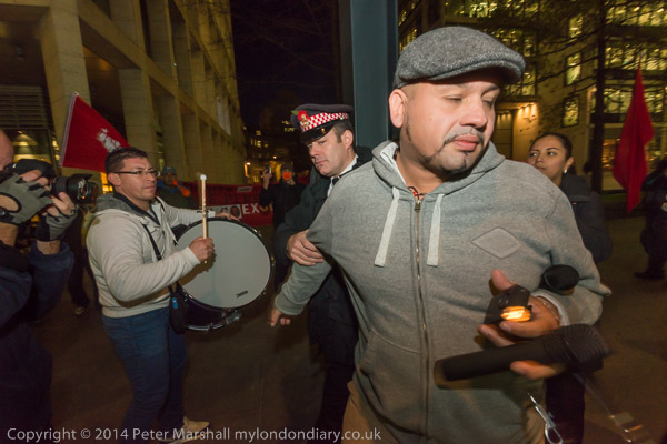 The embassy is in one of the darkest streets in Mayfair (the street lighting probably affected by Crossrail works) and was on a narrow pavement, making it difficult for protesters and photographers. There were speeches in Spanish and English, and a letter was handed in to the embassy; after some delay a man and a woman came out to receive it, listening to the protest continuing for a few minutes before going back inside. I left shortly after.