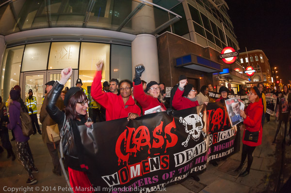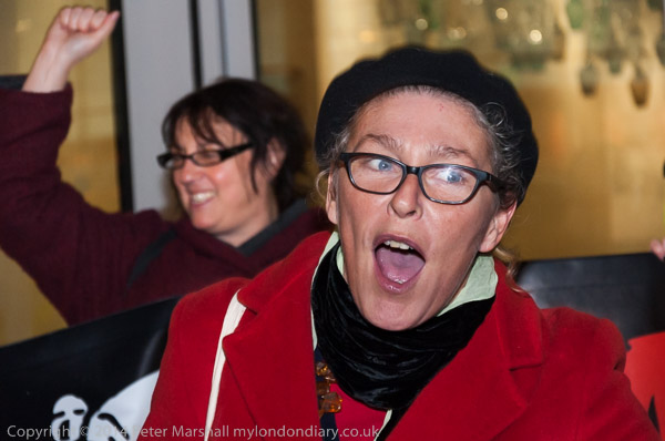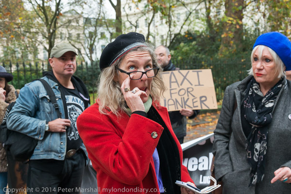 When I photographed this event and first put it on-line, Marina Pepper, who features prominently in these pictures (as she did at the protest) was the Class War candidate for the parliamentary seat at Chingford, currently held by Iain Duncan Smith. Unfortunately soon after this it became clear that her attitude to private education was not compatible with being a Class War candidate, and she was deselected. Class War don't seriously expect to win any seats, but hope that by taking part in the election they can engage with a wider public and put their ideas across.