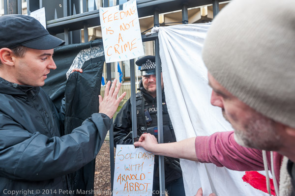 Two police officers arrived and talked with the office staff and then with the protesters. The room in which the protest was taking place was described on a board outside as a "Community Resource Centre" and they could see no problem with the way that is was currently being used by members of the community and so long as they behaved reasonably the police did not want to be involved.