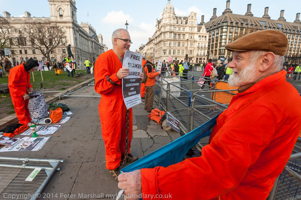 Others at the launch, as well as Joanne MacInnes and Andy Worthington of We Stand With Shaker, and a giant inflatable figure of Shaker Aamer included Clive Stafford Smith, the director of Reprieve, John McDonnell MP (Labour, Hayes and Harlington), Caroline Lucas MP (Green, Brighton Pavilion), comedian Jeremy Hardy and Peter Tatchell, as well as a number of people from the 'Free Shaker Aamer Campaign' who came in the orange jumpsuits and black hoods they have been protesting in week after week for Shaker's release.