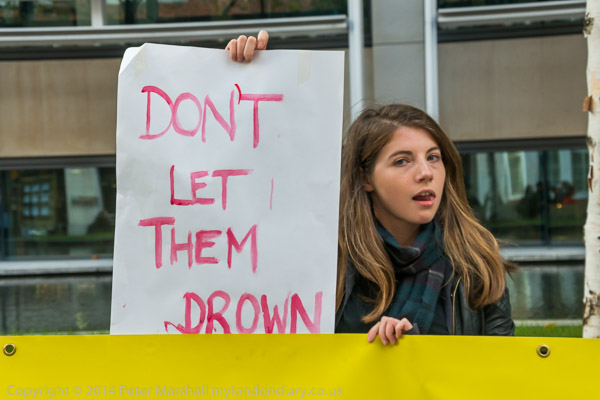When I arrived, half an hour or so after the start of the long protest, there was a crowd of several hundred behind barriers on the narrow pavement on the opposite side of the road from the embassy. More were arriving all the time I was there, and by the time I left, they were on both sides of the road and on the wide central strip of pavement between the two carriageways.