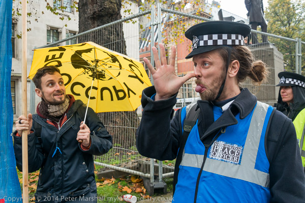 Eventually police allowed them to march towards the embassy and into the pen set up for them and the rally began. A couple of protesters made an attempt to prevent me taking pictures of one of the speakers by holding their flags in front of my camera, but otherwise there were no problems.