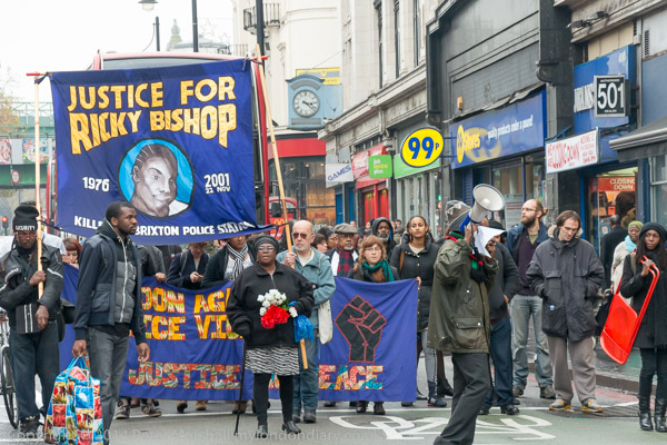 Ricky Bishop, a fit young black man, died from unexplained injuries hours after being taken to Brixton Police Station on 22 Nov 2001. Family and supporters call it a modern day lynching and march annually to remember him and call for justice.