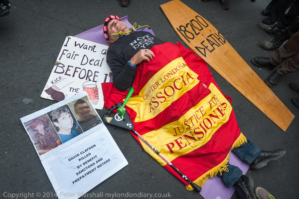 There was a quarter hour 'die-in' on the roadway outside the Energy UK offices, by the end of which most present were happy to get up and continue with speeches on the pavement in front of the doorway. But pensioner Terry Hutt, wearing a t-shirt 'I'm not dead yet' and with a placard 'I want a fair deal before I kick the bucket' continued the die-in for slightly over half an hour longer, while the rally outside Energy UK continued. Police stood around protecting him from the traffic which was diverted onto the opposite side of the one-way road but otherwise did not interfere, and at the end of the protest carefully helped him to stand, checking that he was OK.