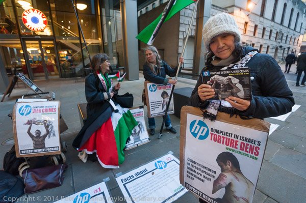 For the 'UK Stop Arming Israel' day of action, the Palestinian Prisoners Campaign protested outside the City offices of Hewlett Packard whose computers and software power the Israeli prisons and war machine, with an informative display, flags and flyers. The protest took place the day before the day of action as the offices are closed on Saturdays.