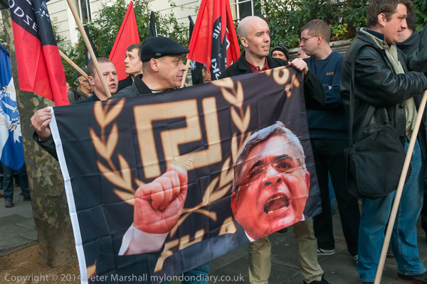 The protest was organised by New Dawn, and Polish group NOP Division England and Nacjonalista.pl and was in support of the Greek neo-Nazi Golden Dawn party of which 50 leading members are currently on trial in Athens for violent attacks, firearms and other offences. New Dawn was set up a year ago in the UK after two members of Golden Dawn were shot dead in front of the party's Athens offices on November 1st, 2013.