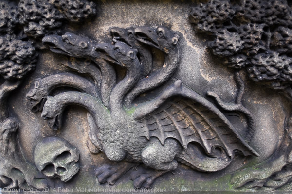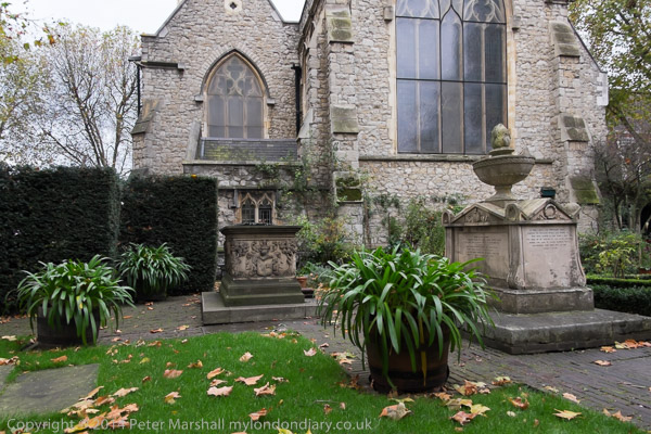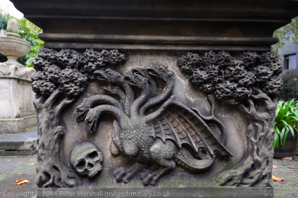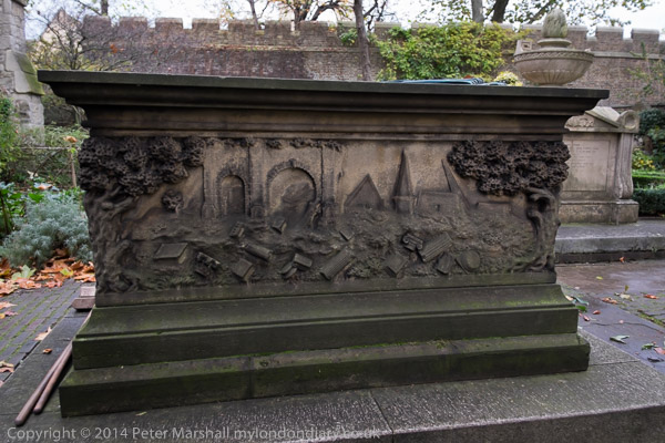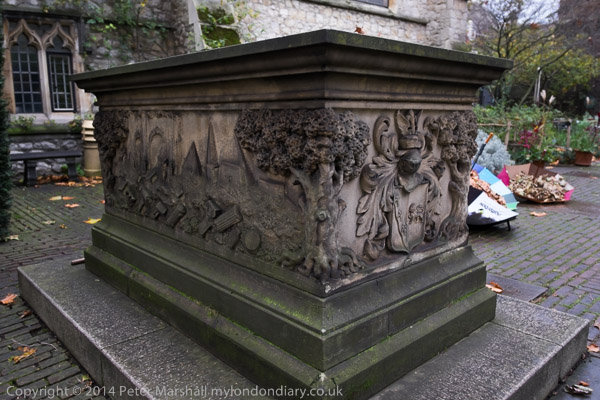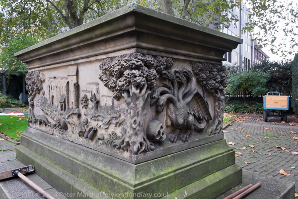 The memorial is in Coade Stone (made in Lambeth) and on its top is a breadfruit - which the Bounty