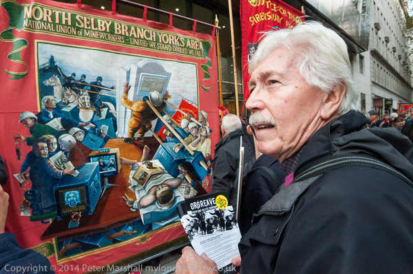 A NUM member holds the North Selby Miners banner at Orgreave Truth and Justice Campaign protest outside the