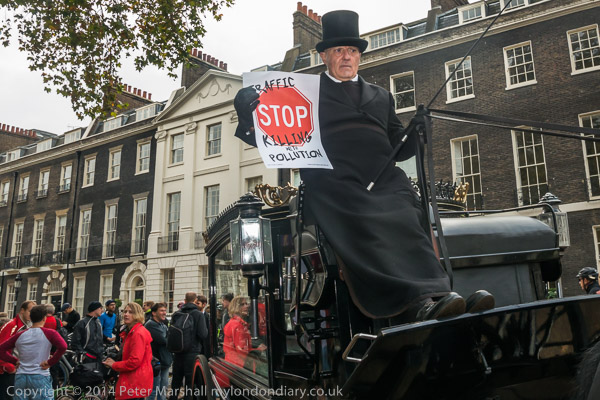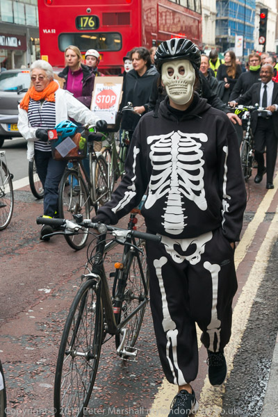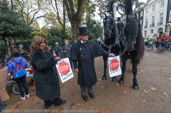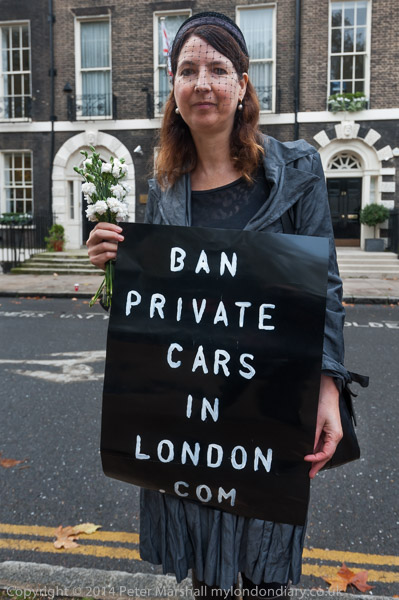 ![]() Cyclists gather for the funeral procession, some with decorated bicycles ![]() ![]() and there is a fine horse-drawn funeral carriage ![]() 'Traffic STOP Killing and Pollution' ![]() ![]() BanPrivateCarsinLondon.com has some interesting information and links - and a blog ![]() A skeleton waiting for the funeral ride ![]() with a woman holding a wreath ![]() Donnachadh McCarthy, undertaker and bagpiper at the start of the funeral procession |