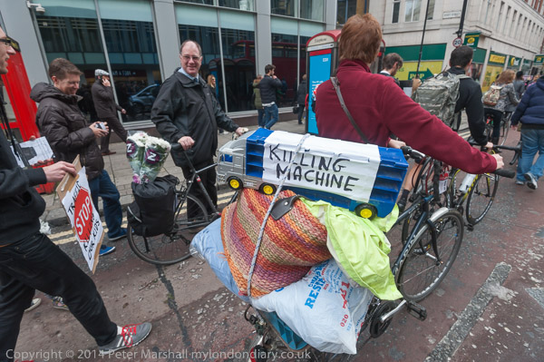 ![]() The carriage containing the coffin reflects the main banner ![]() 14 cyclists were killed in London in 2013 - mostly when vehicles turned left over them ![]() Big lorries are the main things that kill cyclists. 30% are dangerously defective, but the laws are not enforced ![]() A skeleton on the funeral march ![]() 'STOP Traffic Killing our Kids' ![]() 'STOP Traffic Killing with HGVs' ![]() Donnachadh McCarthy holds a poster'DTOP Traffic Killing with HGVs' at the head of the procession in Oxford Circus |