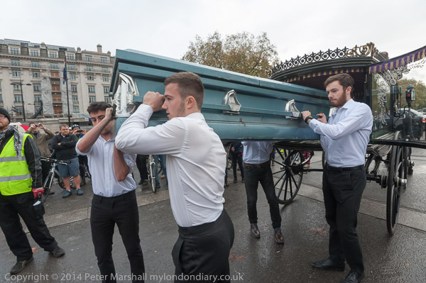 Pall bearers take the coffin from the carriage at Marble Arch
