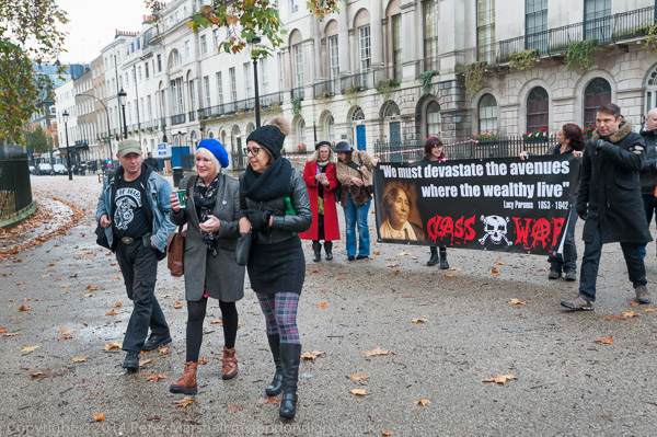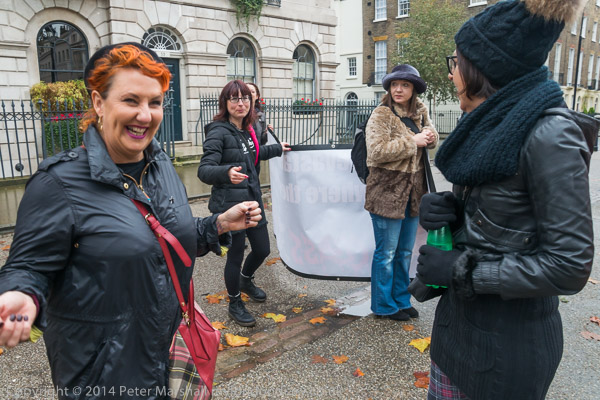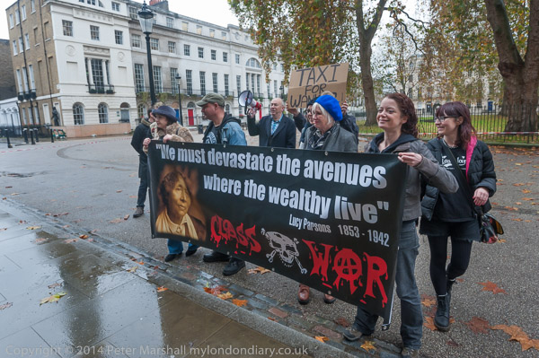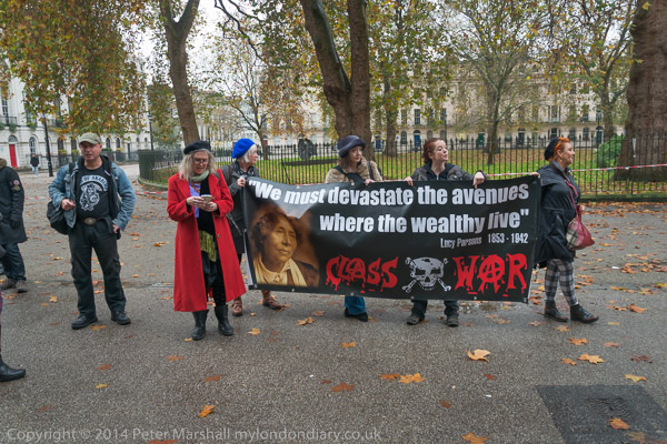 Class War pose with the Lucy Parsons banner outside the £7m Fitzroy Square home of Griff Rhys Jones