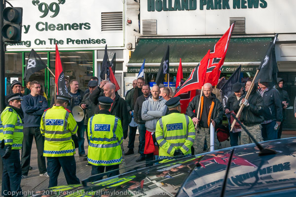 Police stop them just before the turning, just out of sight from the anti-fascists
