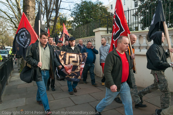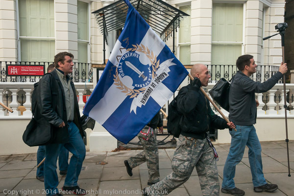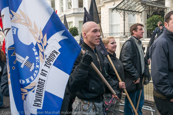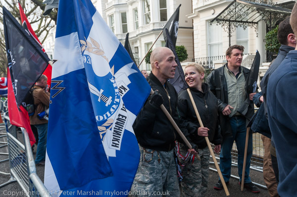 The view from the Greek Embassy of the two groups, neo-Nazis at left, anti-fascists at right, police in the middle