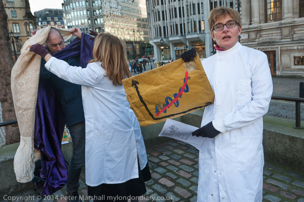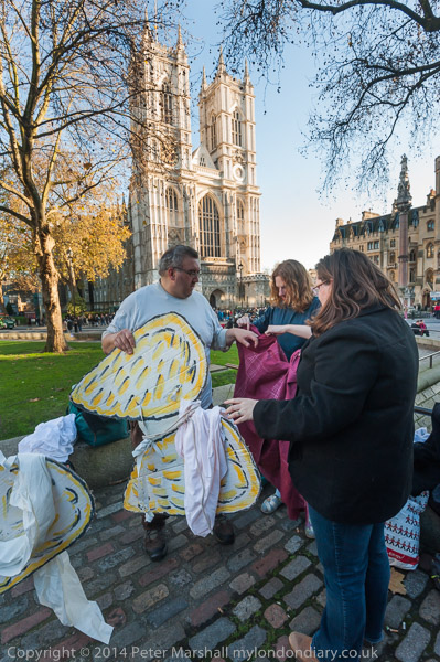 Westly Ingram who wrote and organised the event hands out props with Westminster Abbey in the background. EDF was one of the villains in the play