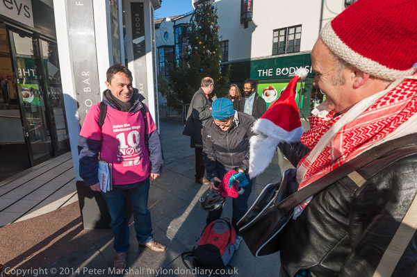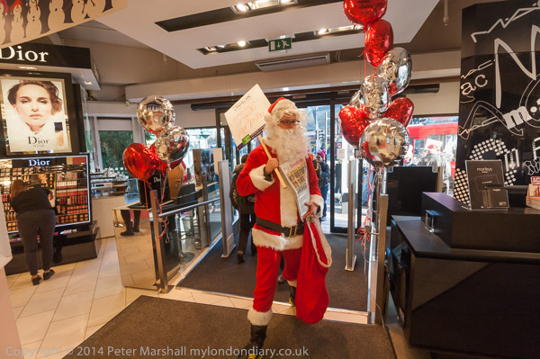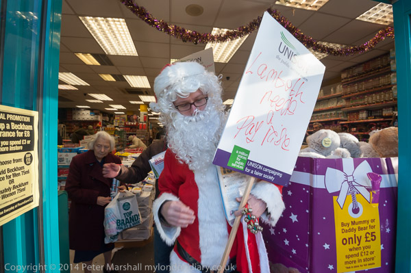 Santa walks into Morley Stores with a placard 'Lambeth Needs a Pay Rise'