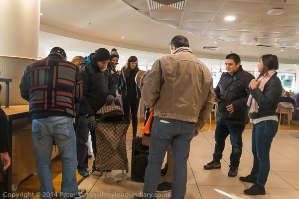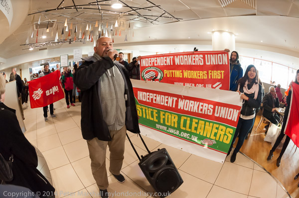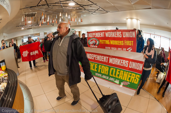 ![]() John Lewis's flagship store on Oxford St as the cleaners were going in to protest for a living wage and equal treatment ![]() It was in the middle of Christmas shopping and a brass quintet were playing inside the store as I made ![]() my way up to the fifth floor ![]() It took me a minute or two to find the cleaners who were in a group getting ready for the protest, getting out the ![]() amplifier and banners at the side of the main counter in the restuarant area ![]() IWGB cleaner's leader Alberto Durango spoke briefly to tell customers and staff why the cleaners were protesting ![]() The cleaners want to be paid a living wage and to be treated like the others who work in the store ![]() John Lewis does not employ the cleaners, but uses a cleaning contractor. The cleaners get low pay, poorer conditions ![]() and are treated as second class citizens in the store. There work is vital but John Lewis refuses to recognise this ![]() Although they are employed by a different company, many of the cleaners have actually worked in the store ![]() for years. The other people who work in the store are directly employed by John Lewis and are 'partners', sharing in the company profits through a bonus |