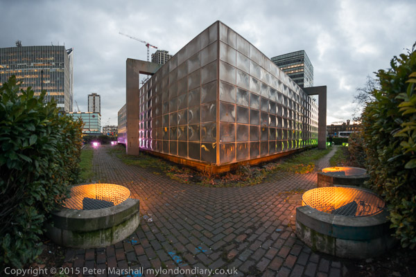 The Underground substation -a memorial to Michael Faraday- in the Elephant and Castle roundabout at dusk