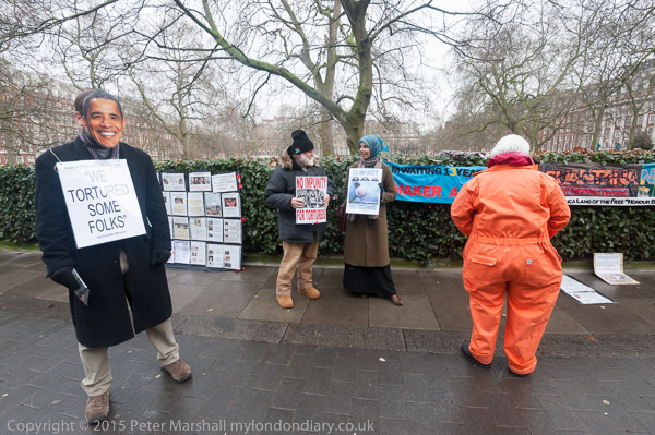 The London Guantánamo Campaign held its usual monthly protest at the US Embassy in Grosvenor Square. These have now kept these up for 8 years, calling for the closure of the prison and release of those still held, including Londoner Shaker Aamer.