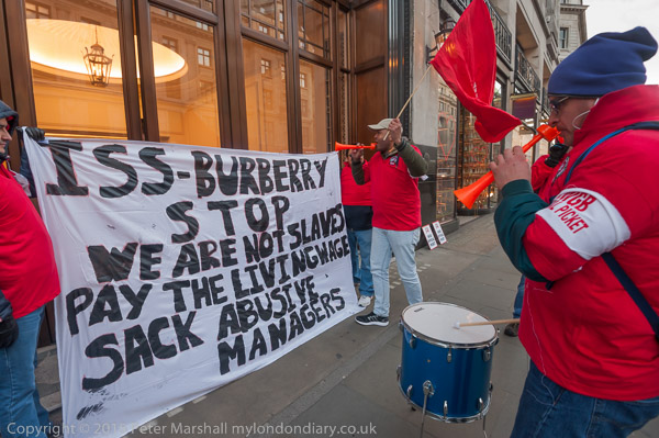 Striking IWGB workers and supporters protested outside Burberry on the wide pavement in Regent St for the London Living Wage, pay for covering absences, uniforms and proper equipment, as well as an end to bullying management by ISS.