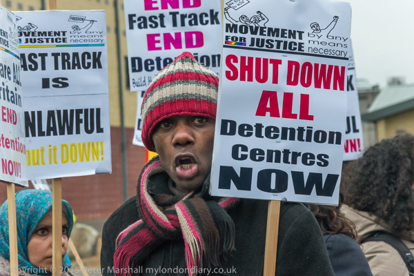 Well over a hundred Movement for Justice protesters at Harmondsworth called for an end to the detained fast track system (DFT) which has been declared illegal by the courts and and end to the scapegoating of immigrants; seeking asylum must not be treated as if it was a crime. They hope to get all immigration prisons like this one at Heathrow closed down.
