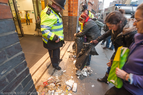 Although police were lined up across the front of the offices, they seemed bemused by what was happening, though the two officers closest to me quickly grabbed a woman holding up a poster about the occupation, enabling me to take photographs and others to empty their sacks.