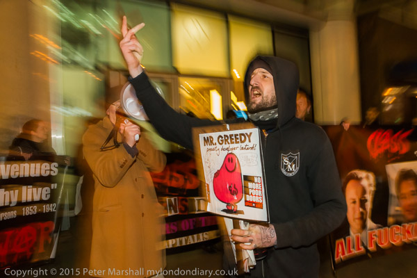 Police had asked Class War to pay for the march to be policed, but Class War told them firmly that the fewer police there were the better. The protest started as usual outside the rich door of One Commercial St. It was raining lightly and at first there were not many protesters, and is seemed likely the march might be called off. But a few more turned up and some were keen to march, so off it set, complete with flaming torches which ensured they would be seen in the dark.