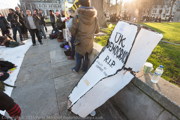 Later in the afternoon I went back to Parliament Square where Occupy Democracy was continuing, By the side of the speaker was the cardboard coffin which was arrested together with Donnachadh McCarthy, slightly crushed but still with its message 'UK Democracy R.I.P. Killed by Corporate Billionaires.'