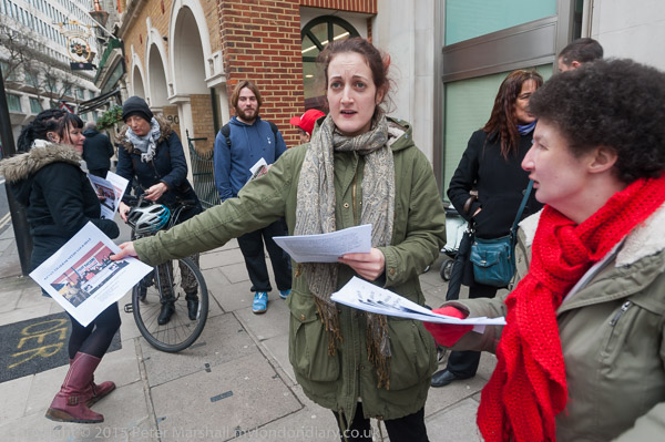 Protesters handed out leaflets about the unfair use of sanctions, which many staff there feel they are forced to make to keep their own jobs, often having to cut off benefits for trivial reasons, forcing more and more people to use food banks.