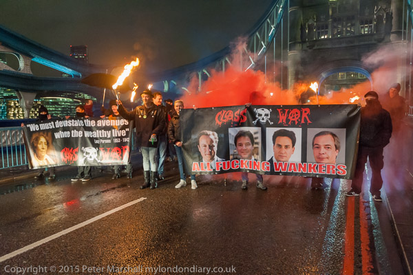 Class War kept up protests over social apartheid in housing; from a 'poor doors' protest with banners and flaming torches at One Commercial St they marched to Tower Bridge, briefly blocking it before protesting against the 'rich gardens' at One Tower Bridge.