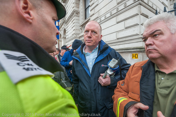 Outside Downing St, the noisy protest blocked Whitehall and the access into Downing St. A senior officer come to talk with Matt Wrack and the other FBU leaders there and was extrememly politie, taking Wrack's mobile number before going away to see if anyone could be persuaded to come out from Downing St to meet the protesters who had told him they would not move until someone had come to talk to them about their pensions, and the promises they feel have been broken over this.
