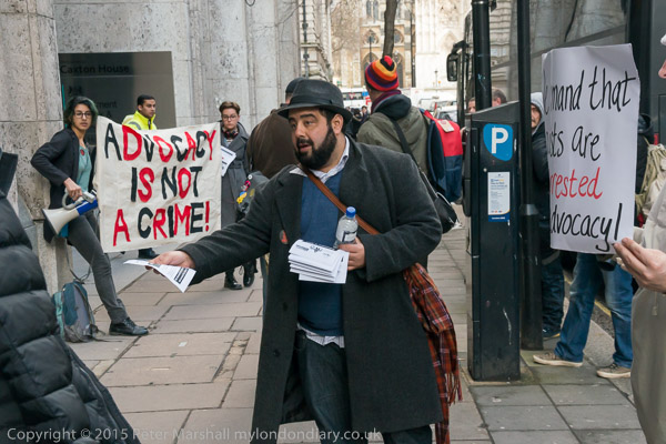 Campaigners stood outside Clive House, the London HQ of HM Prison Service across lunchtime handing out flyers about his case and talking with some of those passing by or going in and out of the offices. The protesters included members of Joint Enterprise: Not Guilty by Association (JENGbA), a grass roots campaign which includes many relatives of those imprisoned under 'joint enterprise', members of FRFI (Figth Racism! Fight Imperialism!) and of Payday Men's Network.