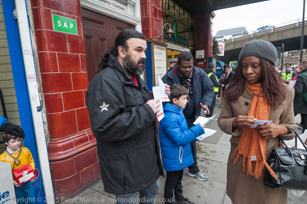 Around 20 RMT Members handed out flyers at the busy Edgware Road Bakerloo Line station today against the proposed 50% cut in station staffing and closure of the ticket office which they claim will endanger the safety of both passengers and staff.
