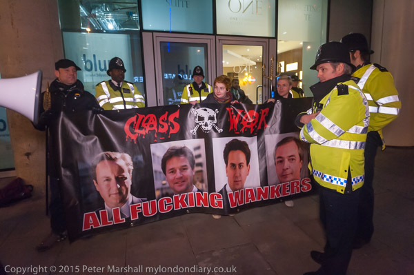 There were more police than normal for the protest outside the 'rich' door of One Commercial St, and as soon as Class War unrolled their banners a police officer , Sergeant C, came to tell them that the 'Party Leaders' banner was offensive and they must remove it.